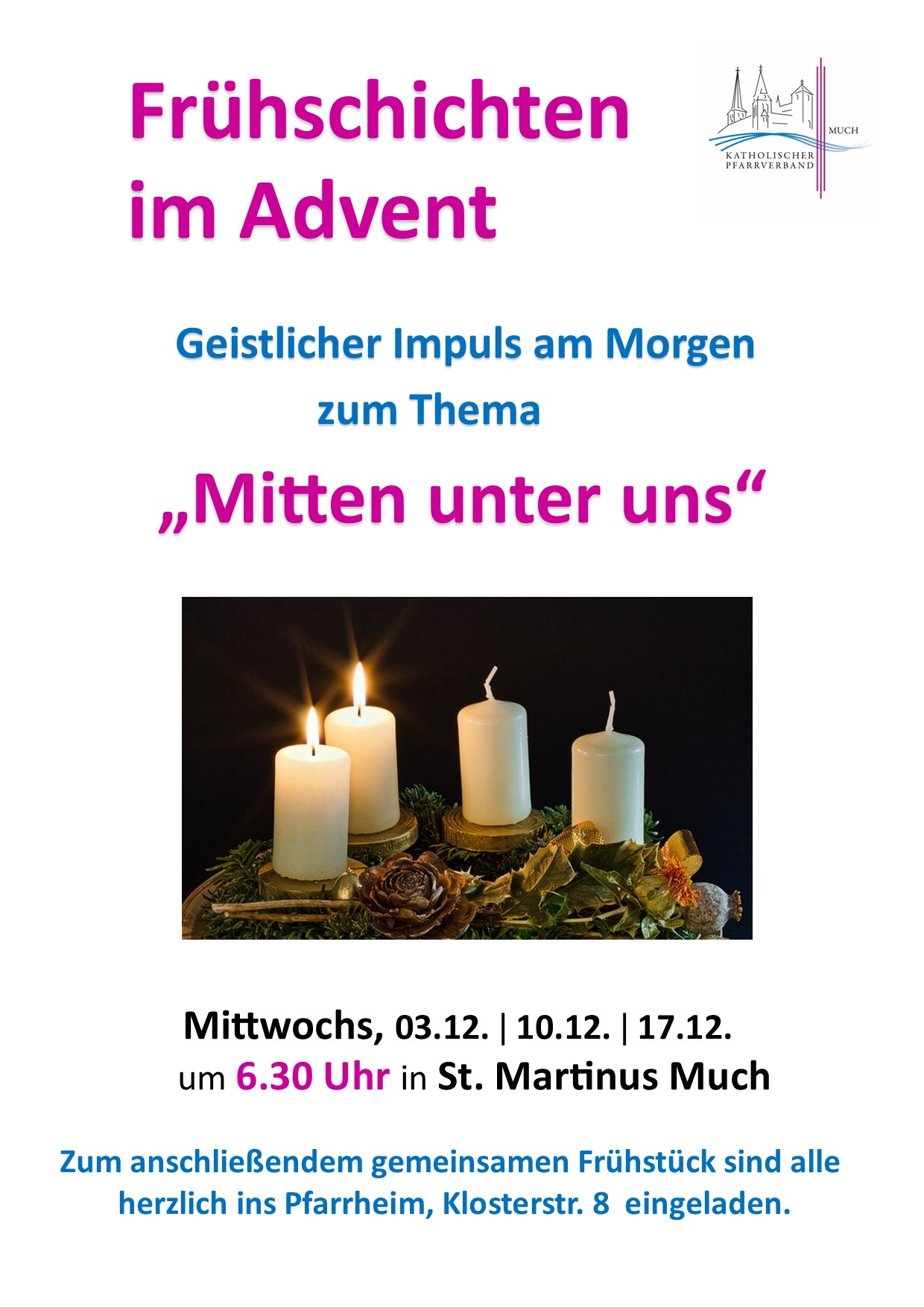 Eine Andacht am frühen Morgen mit anschließendem Frühstück im Pfarrheim Much, Klosterstr. 8. In diesem Jahr stehen die Frühschichten unter dem Thema "Mitten unter uns".